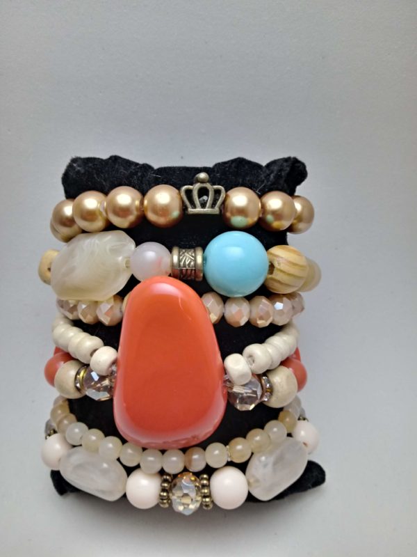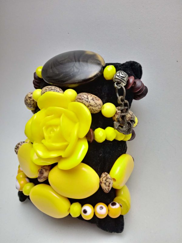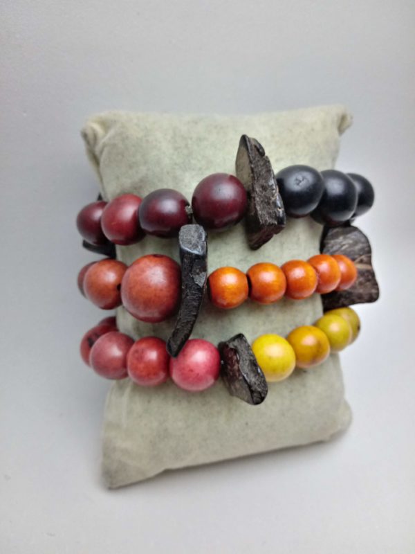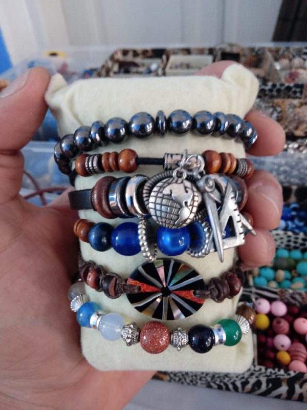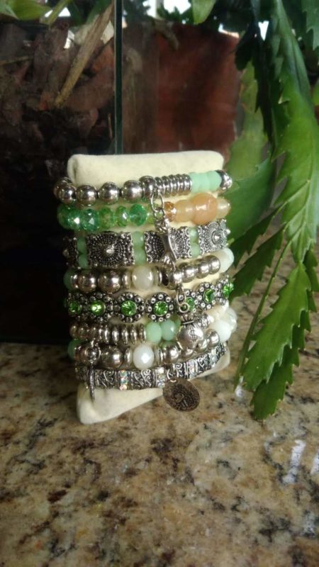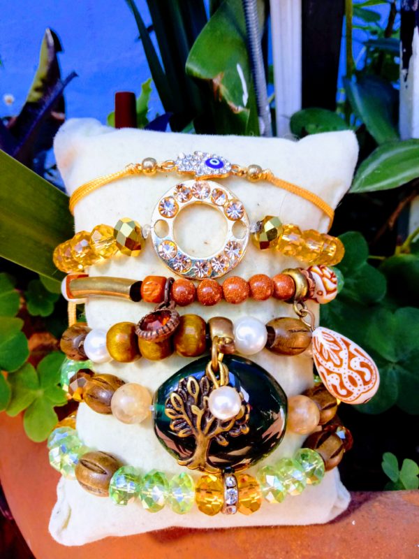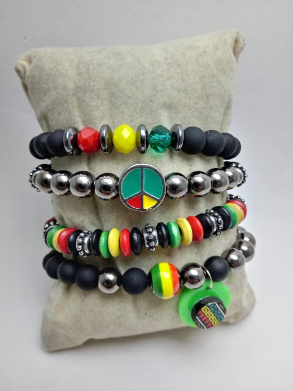 Acima, um mix de pulseiras contando a mesma história com o tema Reggae, são várias formas e elementos como Cristais, entremeios e sementes, que justos se relacionam e formam uma unidade.