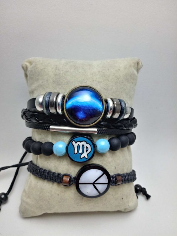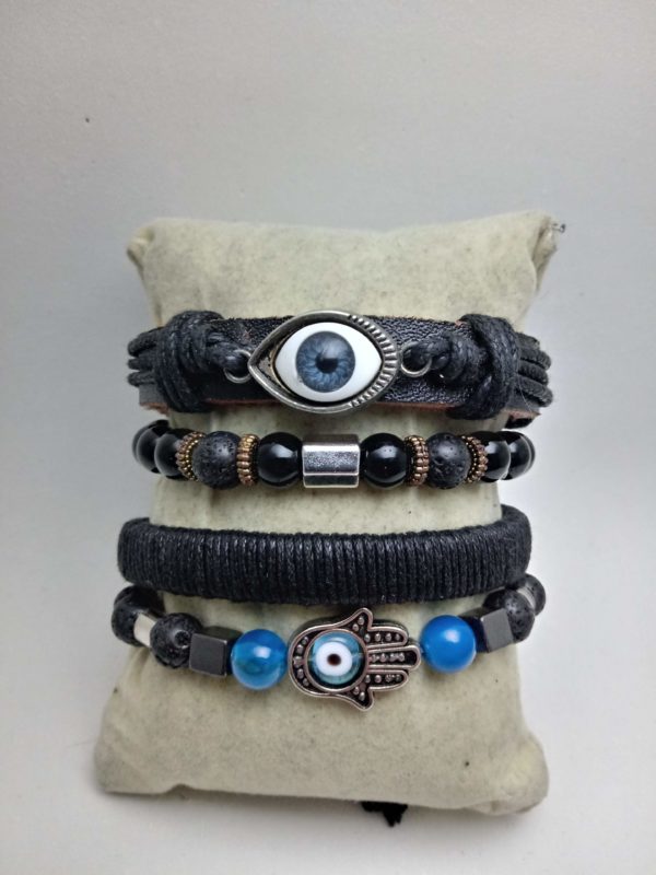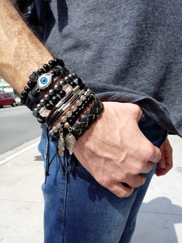 Acima um exemplo de pulseirismo para homem, foi usado couro trançado e liso com pingente de Olho Grego, pedras Hematita e Ônix e Cristais pretos, cada pulseira masculina com uma forma e textura diferente, porém dentro de uma paleta de cores com preto e prata.