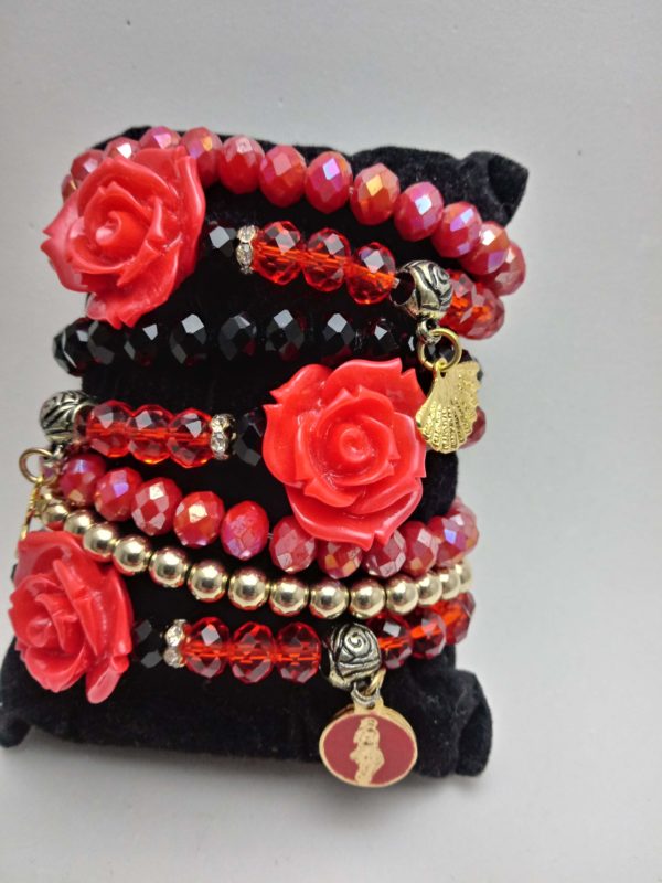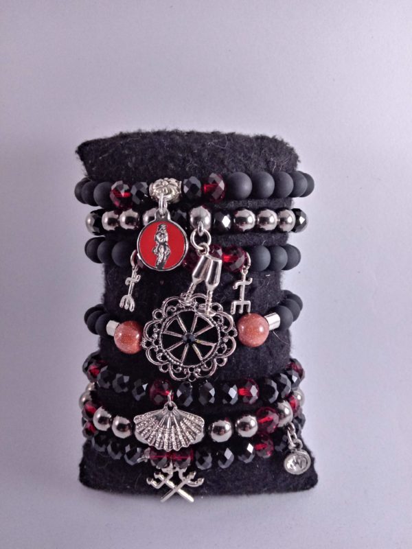 Acima, temos exemplos de Pulseirismo religioso, usado não só para complementar o look mas também como um amuleto. Os dois mix de pulseiras contam a história da Pomba Gira, entidade das religiões de matriz africana, conhecido pela força da feminilidade, suas cores são Vermelho e Preto.