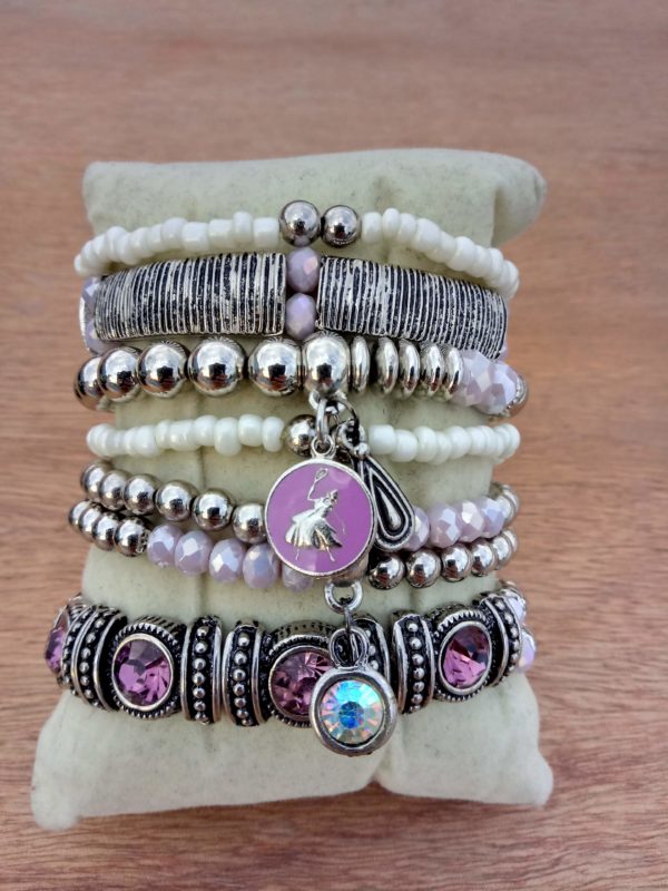 Outro exemplo de mix de pulseiras religiosas, dessa vez do Orixá Nanã Buruque cujo a cor que representa é o Lilás, e também foi usado pulseira de missangas.