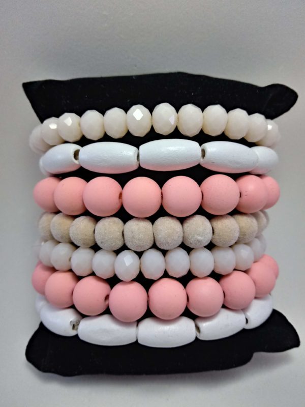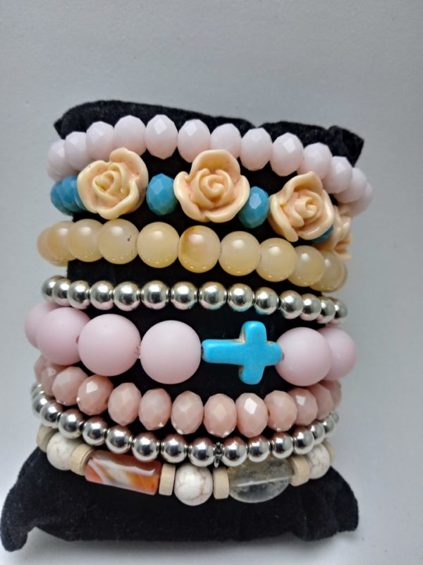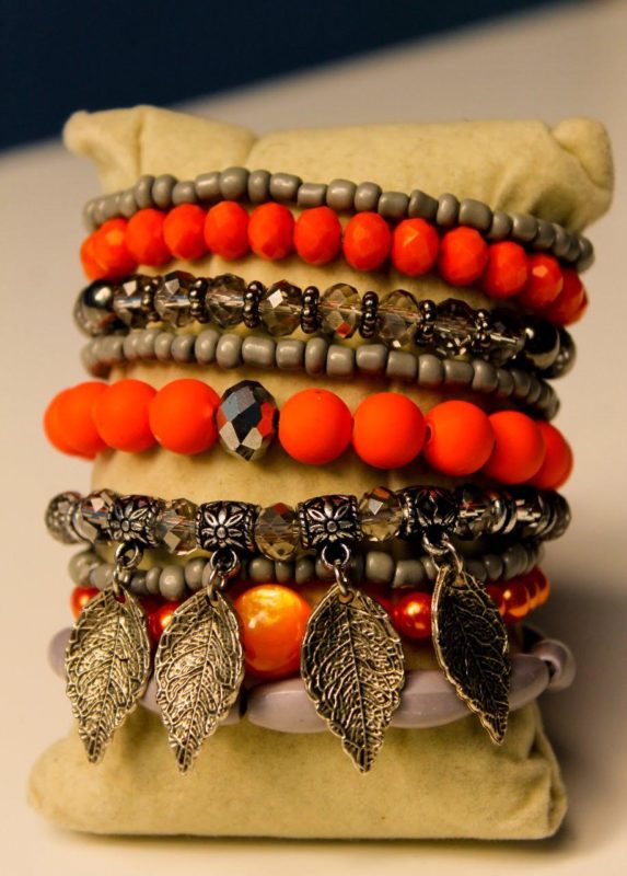 O mix pode ter pulseira de couro (de preferência para couro sintético sem origem animal), pulseiras ou braceletes de metal, pulseiras de pedras naturais, cordões, sementes, missangas, macramê, enfim, todos os materiais podem ser utilizados na composição.