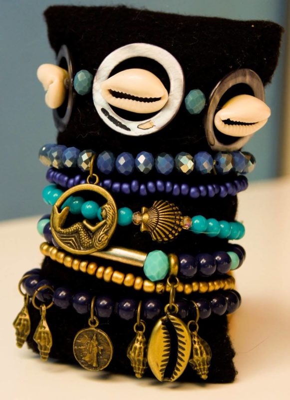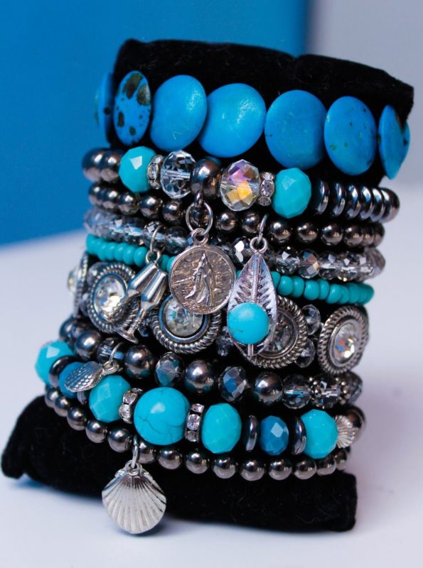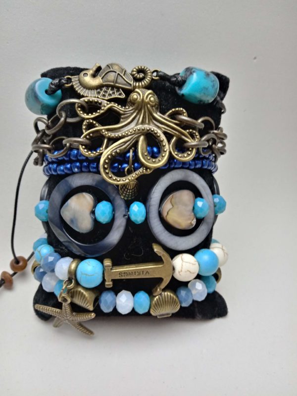 Já esse outro conjunto de pulseiras foi inspirado no mar, com pedras e cristais que lembram o azul do mar, além de vários pingentes e entremeios cor Ouro Velho. As diferentes formas e estilos se unem através da história.