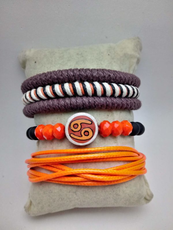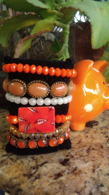 Esse mix de pulseiras teve o tema Olho Grego e as cores Laranja, azul e cinza na composição, além de variadas formas, materiais, texturas e estilos.