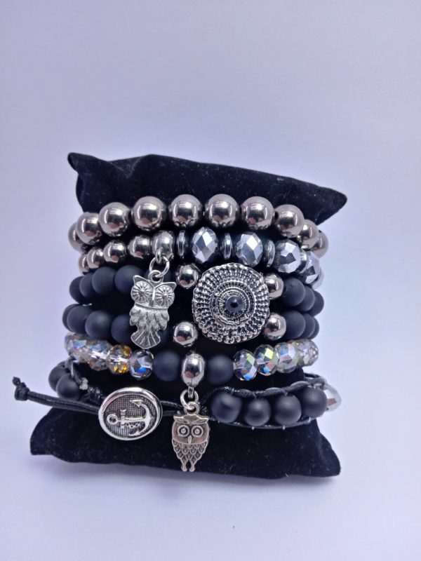 Outro exemplo dentro da mesma paleta de cores preto e prata, com pedras Hematita, Ônix e Lava Vulcânica, também usado pulseira de couro trançado e outra com pingentes, ou seja, vários elementos e formas seguindo o mesmo estilo.